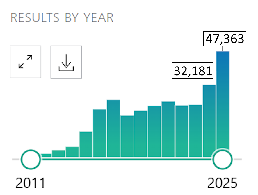 以下の図に示すように、2024年の32,181本の論文を出版したが、2025年には47,363本と、約50%の増加でした。