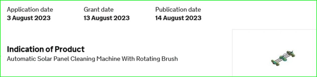 登録状況を詳しく見ていこう。上図(図1)の3番目のコード番号:UKDP-033は、意匠のタイトルが「回転ブラシ付き自動ソーラーパネル洗浄機(Automatic Solar Panel Cleaning Machine with Rotating Brush)」である。以下に示すように、2023年8月3日に出願し、2023年8月13日に認定・登録された。