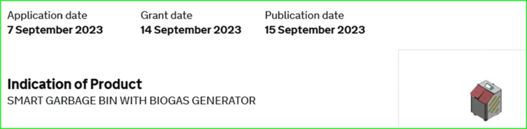 上図(図1)の2番目のコード番号:UKDP-032は、意匠のタイトルが「バイオガス発生器付きスマートゴミ箱(Smart Garbage Bin with Biogas Generator)」である。以下に示すように、2023年9月7日に出願し、2023年9月14日に認定・登録された。