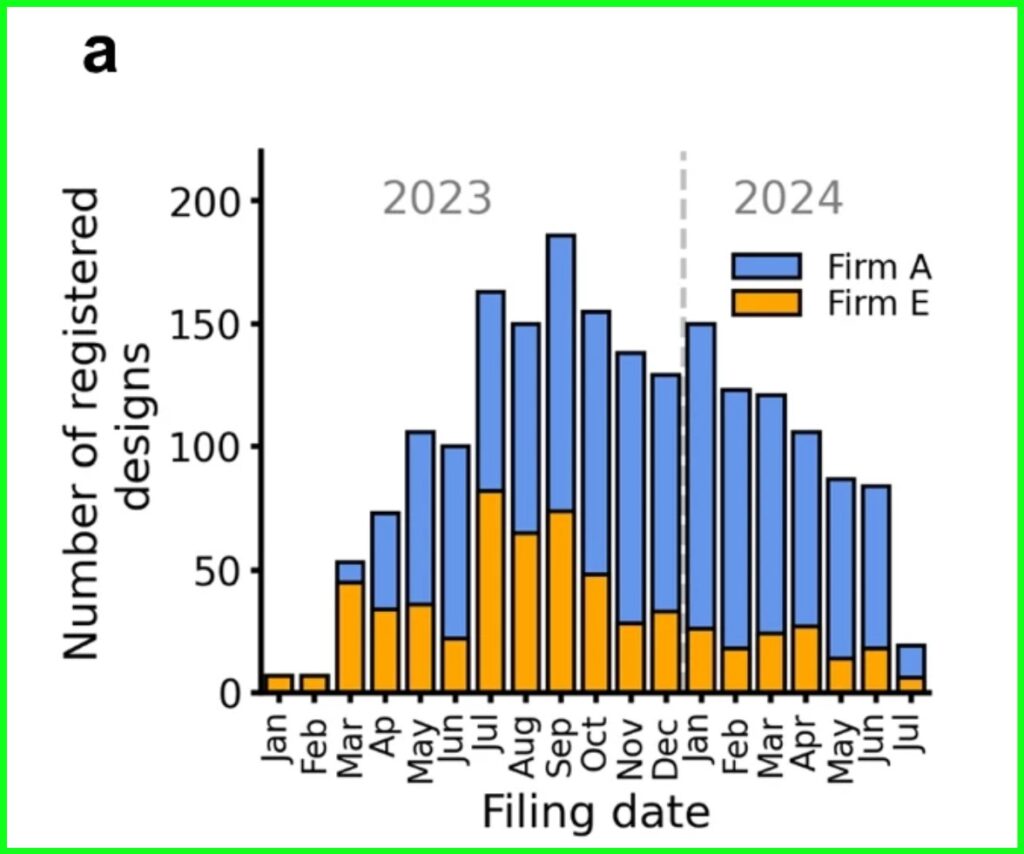 私(リチャードソン)たちは、この2社が英国で出願したすべての登録意匠(A社の1,343 件、E社の614 件、合計1,957 件)をダウンロードした。両社は2023年初頭に英国の登録意匠の出願を開始した(以下の図a)。