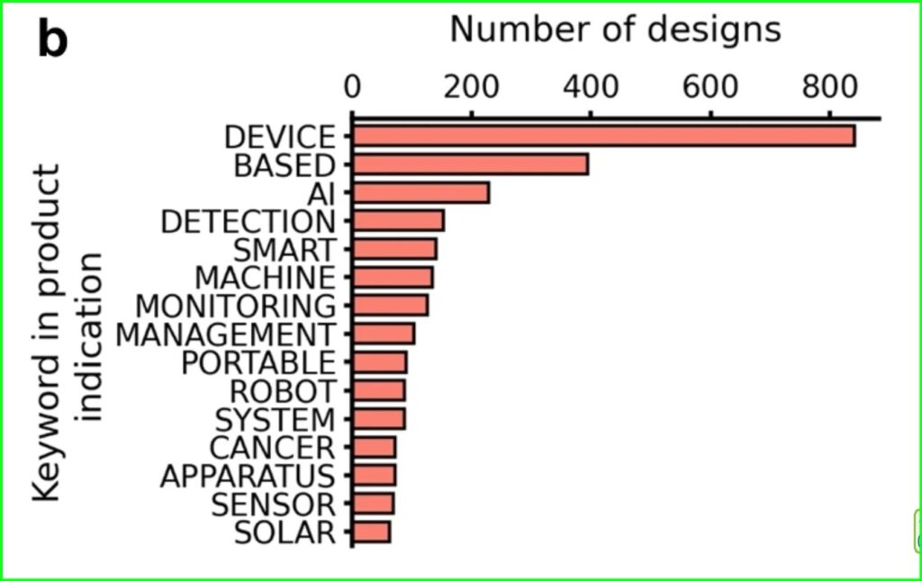これらの企業が出願した意匠のテーマは共通している面があった。意匠の製品表示で人気のキーワードは「デバイス(device)」、「人工知能(AI)」、「スマート(smart)」、「がん(cancer)」などだった(図b)。