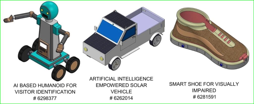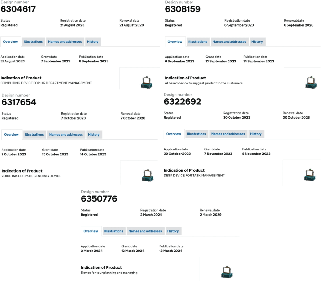 例を挙げると、2023年8月21日~2024年3月2日の間に、同じ画像の5つの異なる意匠を申請していた。その5つの意匠は、タイトルが異なり(「顧客に製品を提案するAIベースデバイス(AI Based Device to Suggest Product to the Customers)」から「音声ベースのメール送信デバイス(Voice Based Email Sending Device)」まで)、創作者も異なっていた(以下の図)。