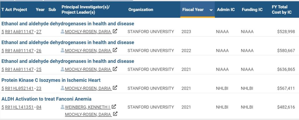 ダリア・モクリー=ローゼン(Daria Mochly-Rosen)は、1989~2023年の35年間にNIHグラントを97件、総額$32,566,040(約32億円)得ていた。巨額である。