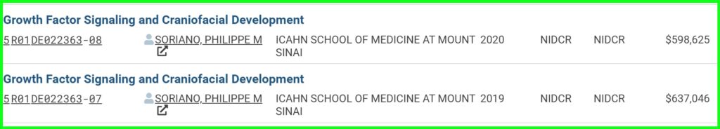 2件の研究業績進捗報告書(R01 DE022363)はボスのフィリップ・ソリアーノ教授(Philippe Soriano)が研究代表者である。 → RePORT ⟩ R01 DE022363