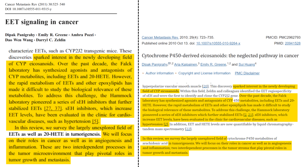2024年4月、Mycosphaerella arachidisが盗用疑惑を指摘した。以下の盗用比較図で、パニグラヒーの左の「2011年12月のCancer Metastasis Rev」論文は、同じ著者の前年の「2010年のCancer Metastasis Rev」論文(右)と、文章がかなり同じ。