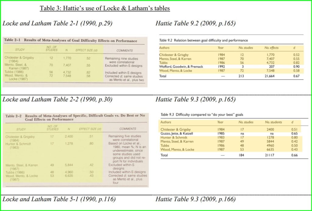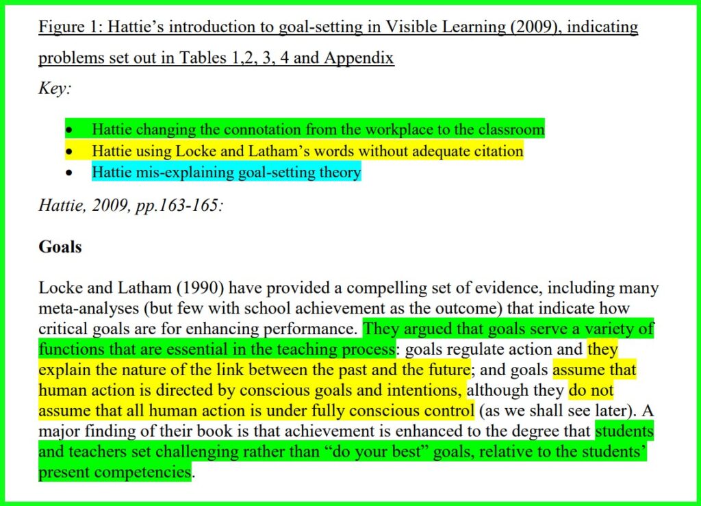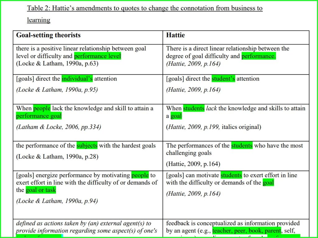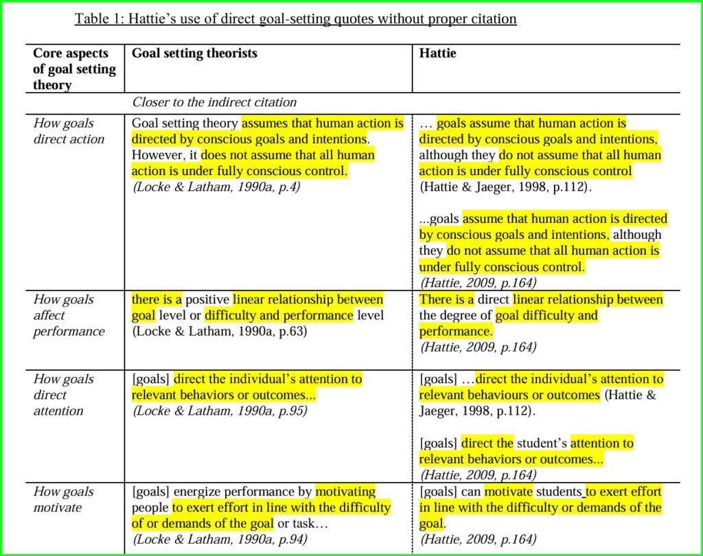 ヴェインカーはその論文で、ハッティが目標設定理論家から文章をそのまま引用し、職場の用語を教育用語に置き換えたと主張した。