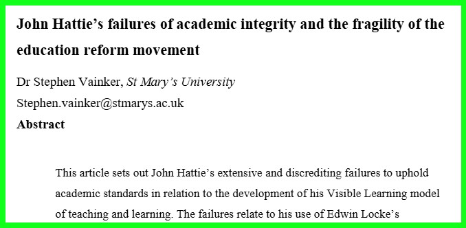 再掲するが、2024年5月29日(74歳)、ヴェインカーは、ヴェインカーは最初の調査結果をまとめ、「ジョン・ハッティの研究公正の失敗と教育改革運動の脆弱性」と題する47ページの論文を発表した。 →SocArXiv Papers | John Hattie’s failures of academic integrity and the fragility of the education reform movement(以下は冒頭の一部)