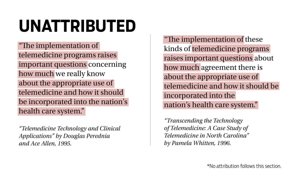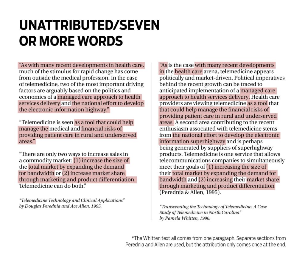以下の盗用比較図の出典:Is copied language in Whitten’s dissertation plagiarism? Experts weigh in – Indiana Daily Student