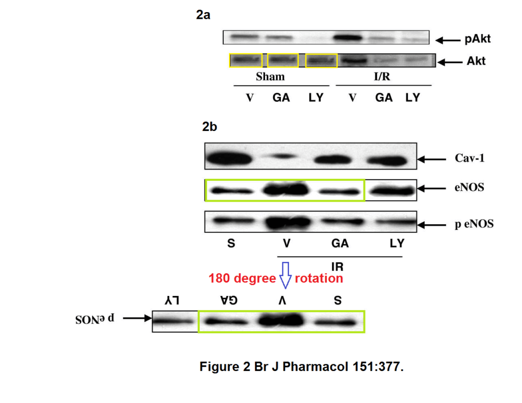 しかし、この画像を90度回転した画像が、同時期に同じ研究者が「1999年のEur J pharmacol」論文の図4(下図右)として発表していた。しかも、後者ではカラギーナン投与ラットの肺のニトロチロシン染色と説明していた。